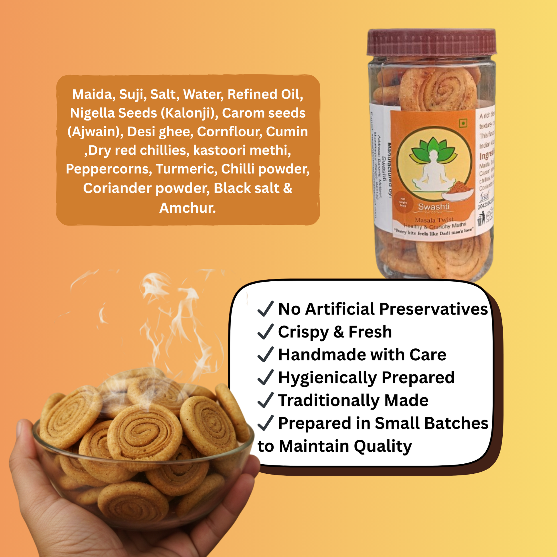 Traditional crispy Masala Mathri made with premium ingredients. Handmade, hygienic and perfectly spiced for a delicious tea-time snack.